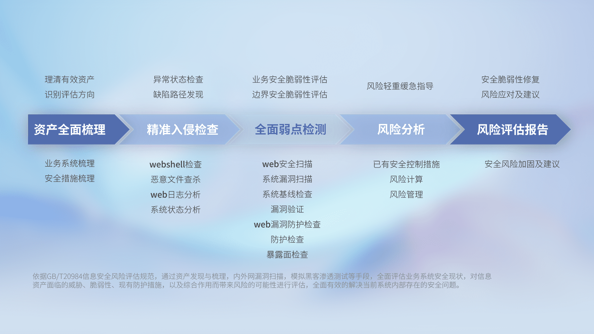 针对客户行业特性,,,,以专业的安全服务+多厂商联合解决方案提供专属的一站式安全管理服务,,,,帮助客户全面感知网络空间威胁,,,基于识别、、、检测、、分析、、、、防护、、监测、、响应的服务理论模型,,,,从方案咨询、、、、集成交付、、、、评估验证、、、优化加固、、、运维运营,,,,致力于为客户提供完整的闭环管理式安全服务。。。。以实战经验为客户打造高抵御风险的安全体系,,帮助客户发现威胁、、、对抗威胁、、、处置威胁,,不断积累安全对抗能力,,,持续保障数字化安全。。